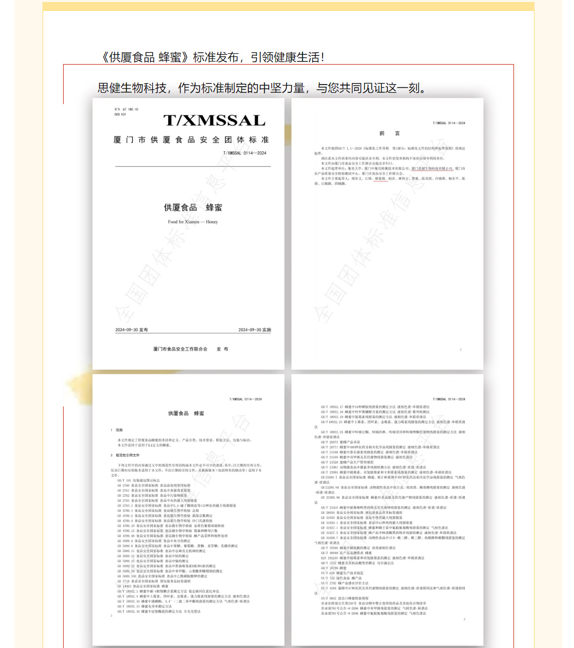 快訊:供廈標(biāo)準(zhǔn)《供廈食品 蜂蜜》 2024-9-30發(fā)布實(shí)施 思健生物科技很榮幸參與該標(biāo)準(zhǔn)制定